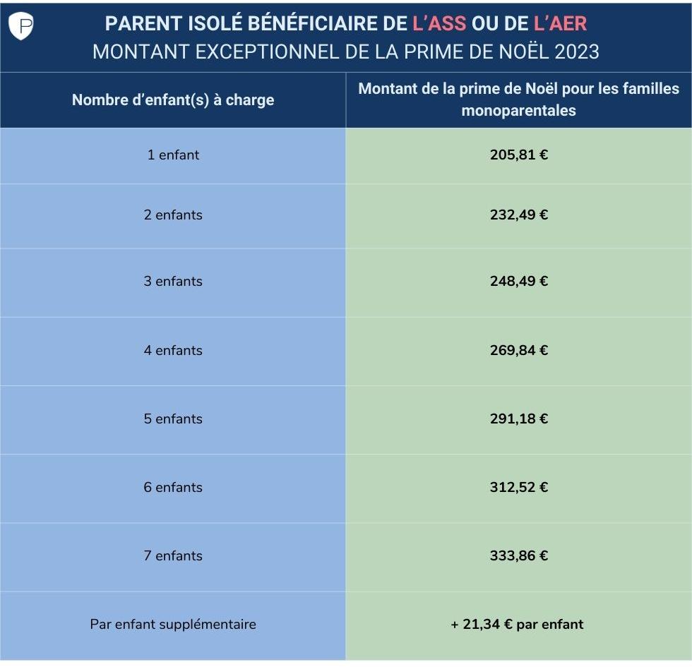 Si vous êtes bénéficiaire de l’ASS ou de l’AER et parent isolé, le montant de votre prime de Noël dépend de votre situation familiale. Il s’échelonne de 205,81 € si vous n’avez qu’un enfant, à 333,86 € si vous avez 7 enfants :