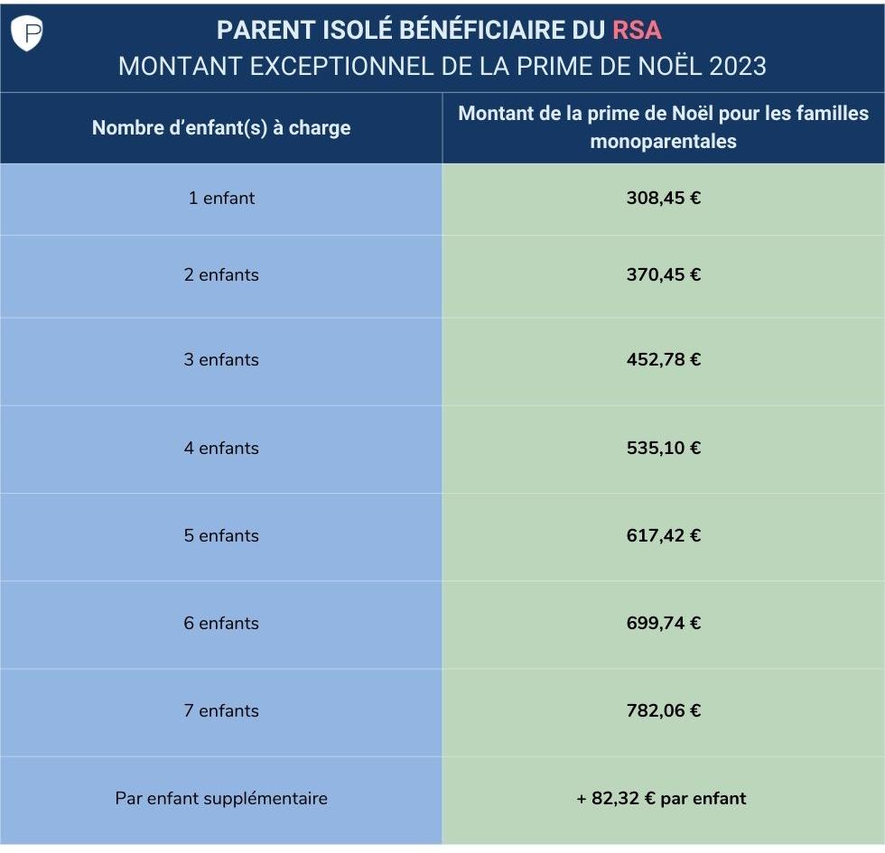 Si vous êtes bénéficiaire du RSA et parent isolé, le montant de votre prime de Noël dépend de votre situation familiale. Il s’échelonne de 308,72 € si vous n’avez qu’un enfant, à 782,06 € si vous avez 7 enfants :
