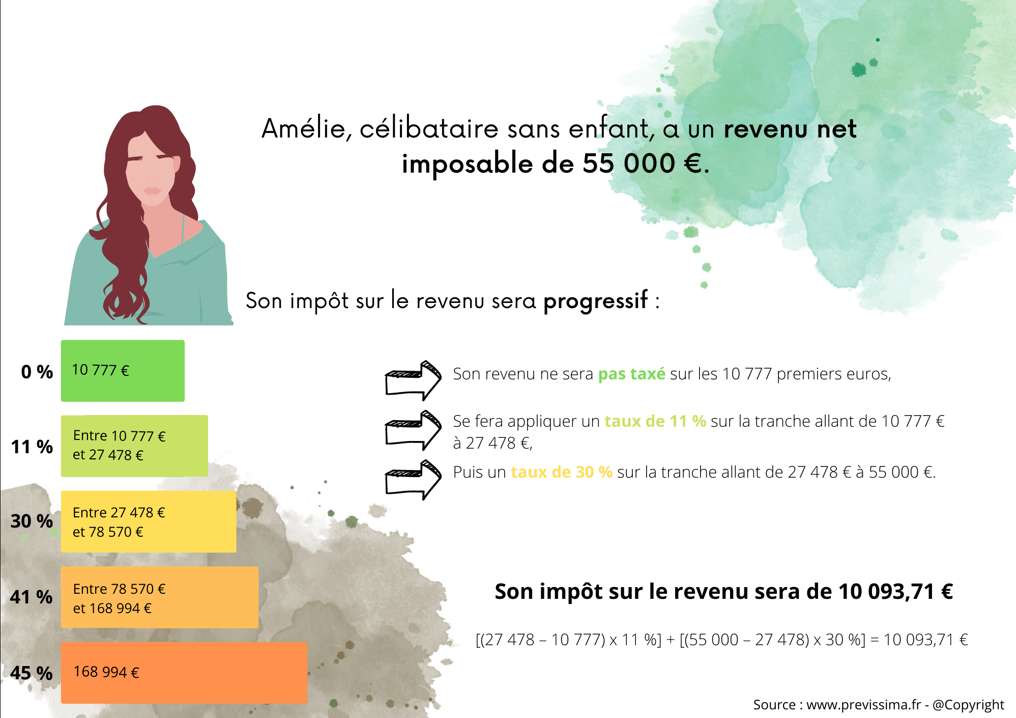 Amélie, célibataire sans enfant, a un revenu net imposable de 55 000 €. Son impôt sur le revenu sera progressif : il ne sera pas taxé sur les 10 777 premiers euros, se fera appliquer un taux de 11 % sur la tranche allant de 10 777 € à 27 478 €, puis un taux de 30 % sur la tranche allant de 27 478 € à 55 000 €.