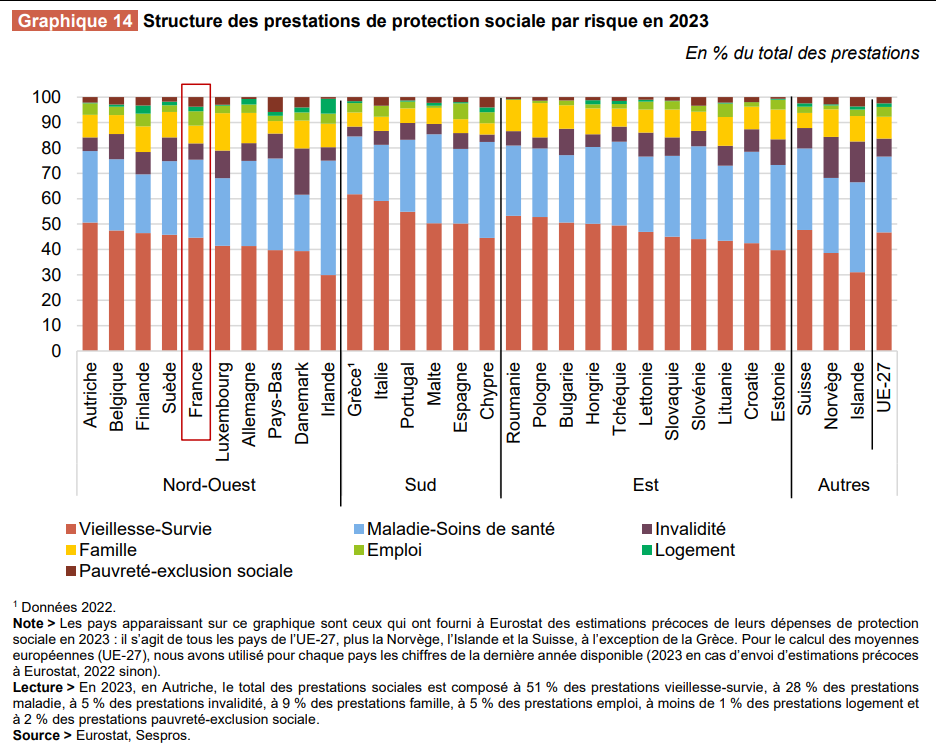 Dans une étude publiée le 29 janvier 2025, la Direction de la recherche, des études, de l’évaluation et des statistiques (DREES) réalise une comparaison internationale des dépenses de protection sociale (maladie, invalidité, vieillesse, famille, emploi, logement, pauvreté, exclusion sociale) en Europe en 2023.