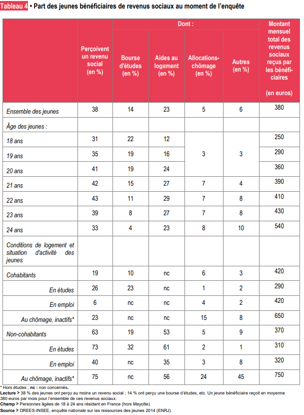 Dans un dossier publié le 28 janvier 2019, la DREES* analyse la composition des ressources des jeunes de 18 à 24 ans. Les revenus sociaux correspondent à une part non-négligeable de revenus pour 38 % des jeunes (en moyenne 380 euros / mois). Ces revenus peuvent transiter par les parents des jeunes adultes : 44 % d’entre eux perçoivent des prestations sociales, pour un montant moyen de 460 € / mois.