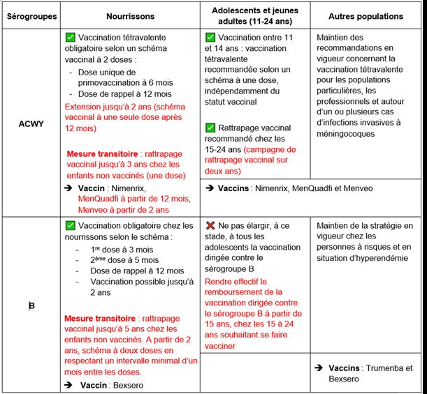 - À titre transitoire, la HAS suggère de mettre en œuvre un rattrapage ciblant les enfants jusqu’à 3 ans non vaccinés contre le sérogroupe ACWY
