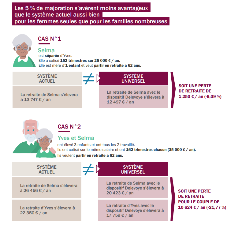 « Tel que formulé, le Rapport Delevoye laissait à penser que dans la plupart des situations, le dispositif serait plus favorable aux familles par rapport à la situation actuelle. » Pour l’IPS, ces nouvelles règles sont préjudiciables, notamment aux femmes seules et aux familles nombreuses, car elles suppriment deux dispositifs existants :