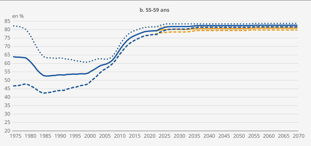 Ainsi, à horizon 2070, le taux d’activité (c’est-à-dire le rapport entre le nombre d’actifs et l’ensemble de la population) augmenterait de :