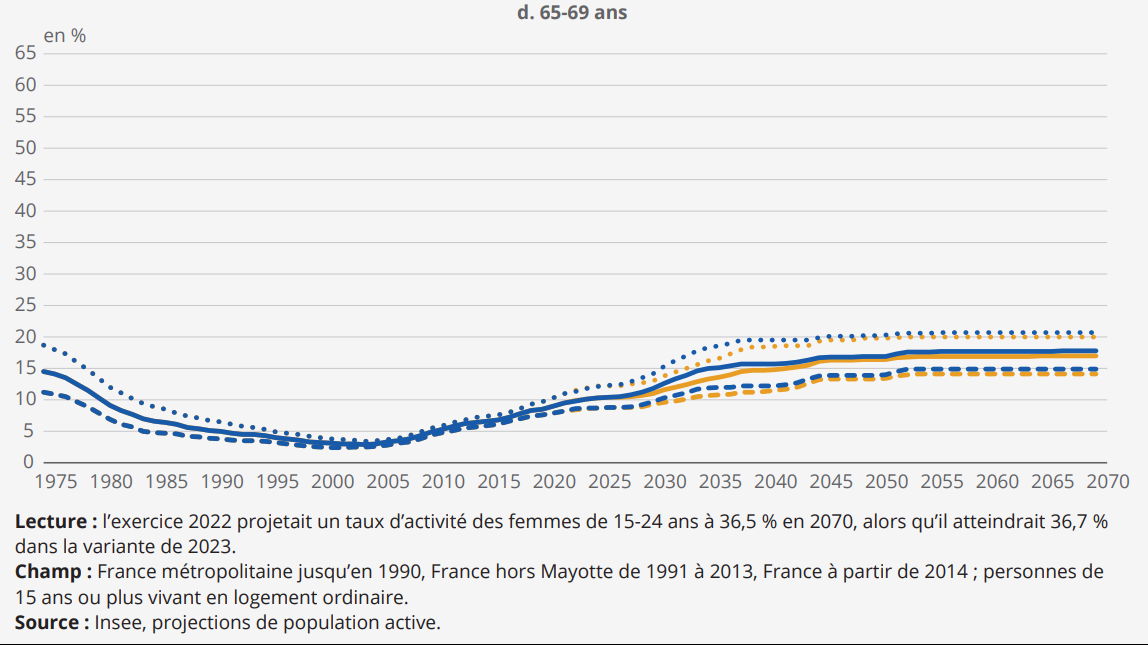Le recul d’âge d’ouverture des droits à la retraite de 62 à 64 ans, l’allongement de la durée minimale des carrières longues, ainsi que l’augmentation de la durée de cotisation de 42 à 43 ans influencent directement la taille de la population active projetée.
