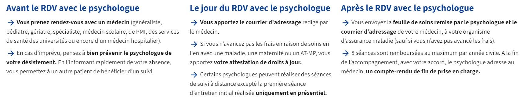 Pour bénéficier du remboursement de la Sécurité sociale, le patient doit choisir le psychologue parmi ceux partenaires du dispositif. Les coordonnées des praticiens partenaires sont accessibles en se rendant sur le site https://monsoutienpsy.ameli.fr/recherche-psychologue.