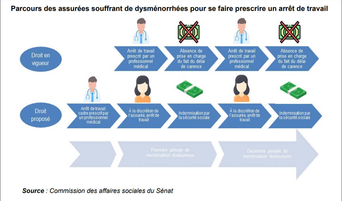 La proposition de loi entend justement remédier à cette situation en créant « un arrêt maladie pour douleurs menstruelles » sans jour de carence, c’est-à-dire avec une prise en charge immédiate.
