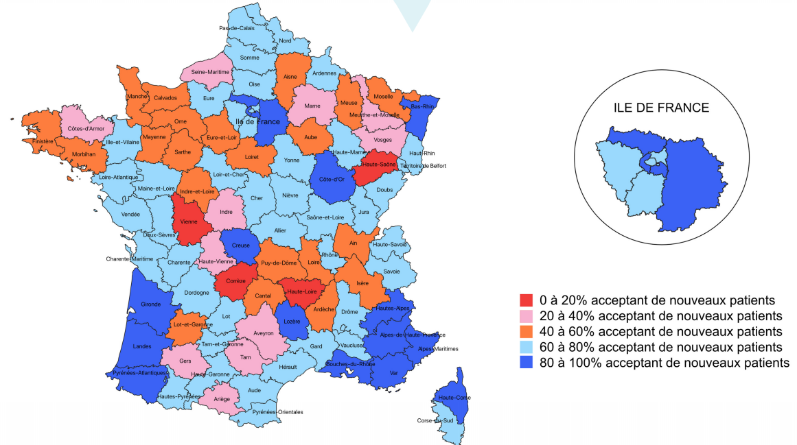 Concernant les délais moyens d’attente avant le rendez-vous, ils oscillent entre 1 à 563 jours : « Il faudra s'armer de patience en Indre, en Lozère ou dans le Cantal avec respectivement 217, 201 et 193 jours d'attente. A contrario, Paris avec 20 jours, les Alpes-Maritimes avec 27 jours ou la Seine-Saint-Denis avec 29 jours présentent des délais d'attente très bas. »