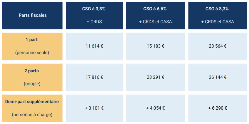 En ce qui concerne la CSG, son taux (exonération, 3,8%, 6,6% et 8,3%) sera modifié si vos revenus progressent au-delà ou en deçà de certains seuils :