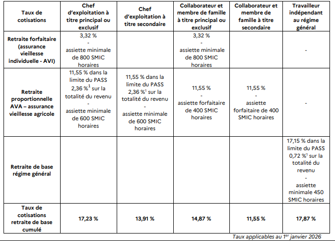 - La fusion des cotisations d’assurance vieillesse de base AVI et AVA en une seule cotisation de retraite de base. Elle sera identique à celle due par les indépendants non-agricoles affiliés au Régime général. Elle sera calculée pour partie sur la part de l’assiette inférieure ou égale au PASS, et pour partie sur la totalité de l’assiette ;