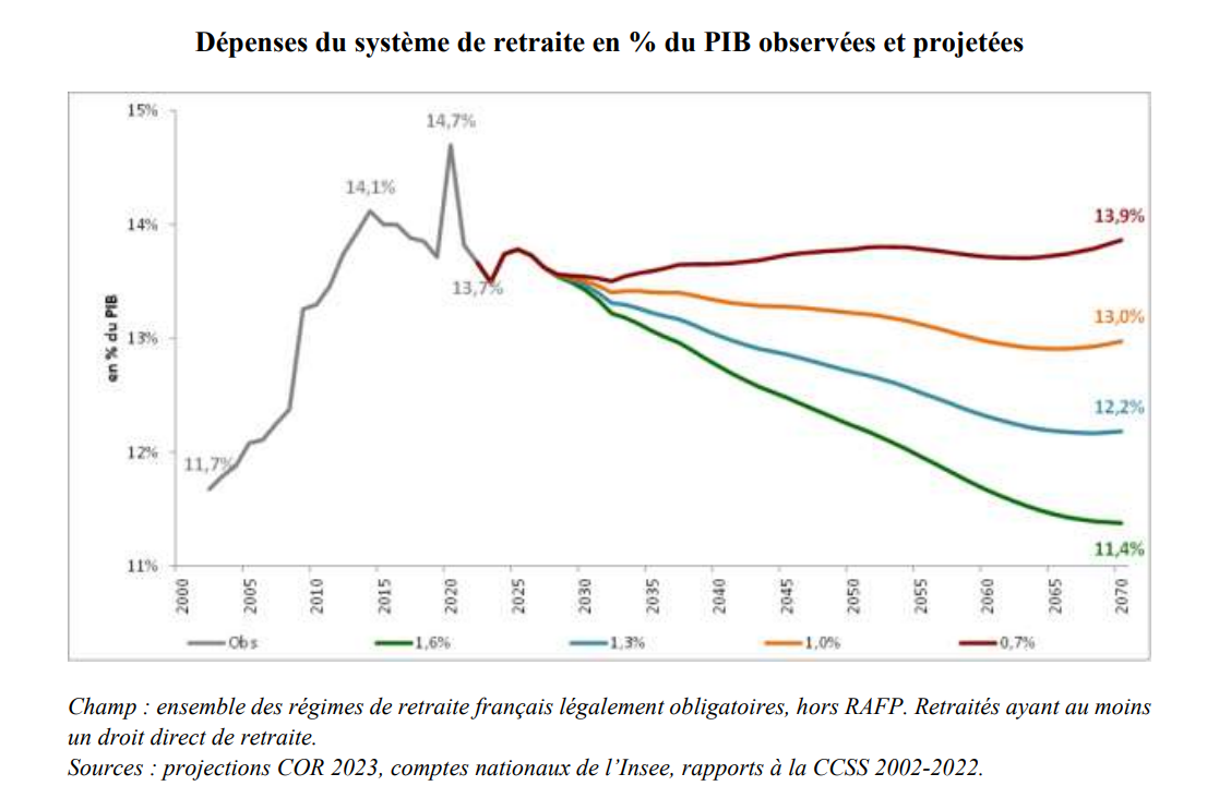 - À compter de 2030, elles oscilleraient entre 11,4 % et 13,9 % selon le scénario. Baisse qui signifie qu’ « il faudra consacrer une part moindre de la richesse nationale au financement public des retraites par rapport à ce qui était anticipé avant la réforme » ;