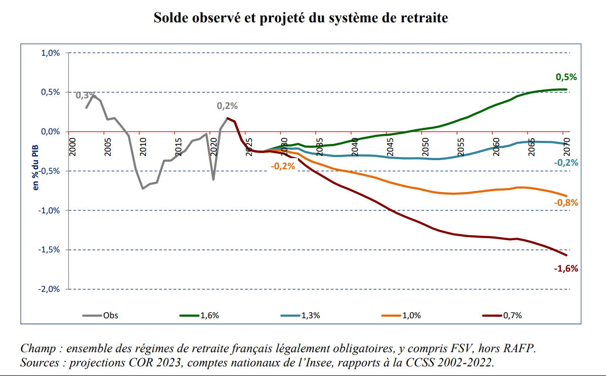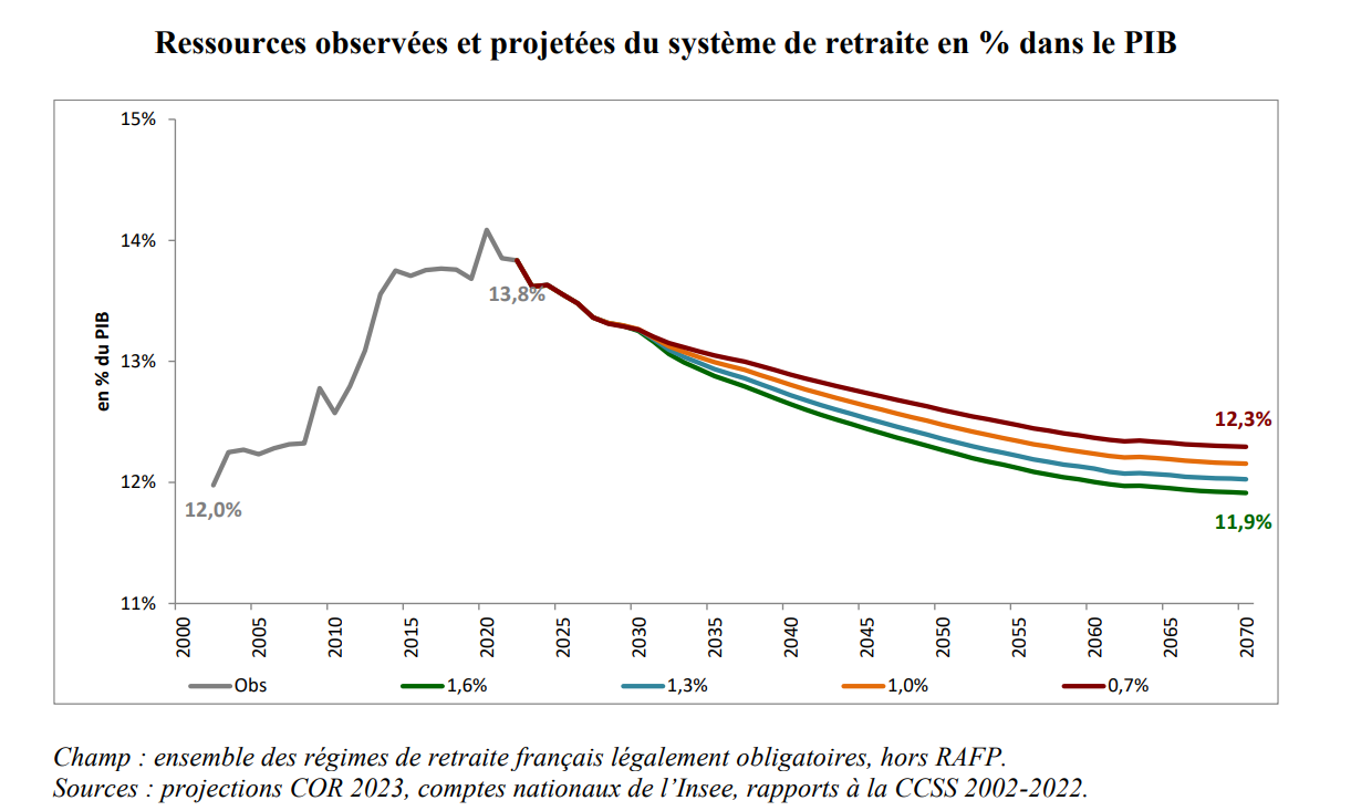 Par ailleurs, selon les projections du COR, les ressources du système des retraites qui représentaient 13 ,8 % du PIB en 2022, devraient rapidement diminuer entre 13,2 % et 13,3 % du PIB en 2030 pour se situer autour de 11,9 % en 2070 selon le scénario +1,6 %.