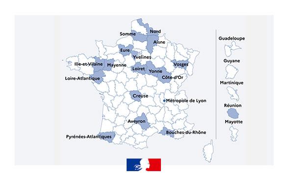 Aujourd’hui, des expérimentations sont déjà menées dans 18 territoires, à savoir : l’Aisne, l’Aveyron, les Bouches-du-Rhône, la Côte-d’Or, la Creuse, l’Eure, l’Ille-et-Vilaine, la Loire-Atlantique, le Loiret, la Mayenne, la métropole de Lyon, le Nord, les Pyrénées-Atlantiques, La Réunion, la Somme, les Vosges, l’Yonne et les Yvelines.