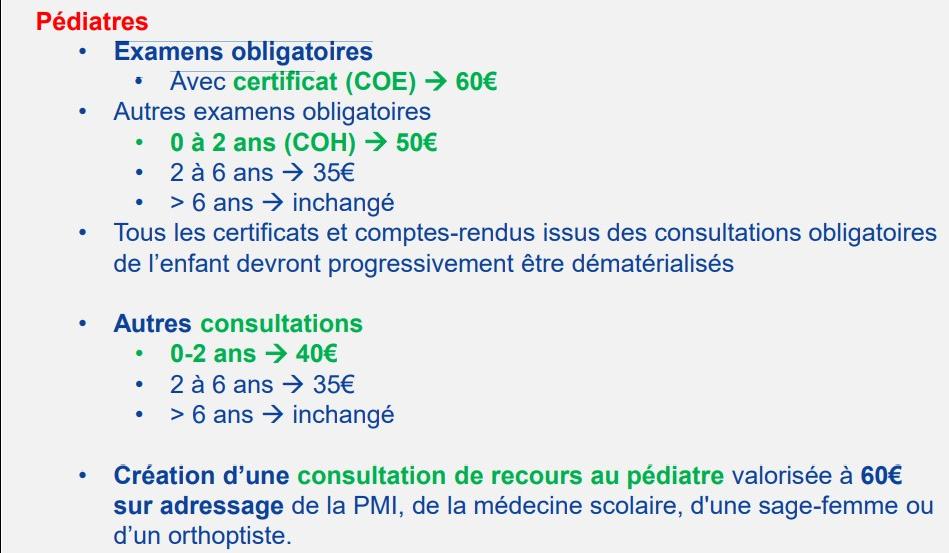En outre, une consultation de recours au pédiatre valorisée à 60 € sur adressage écrit de la protection maternelle et infantile (PMI), de la médecine scolaire, d'une sage-femme, d’un orthophoniste ou d’un orthoptiste est créée à compter 1er juillet 2025. Cette consultation ne pourra être facturée plus d’une fois par an pour une sollicitation du même demandeur, et dans la limite de 3 fois par an pour un même patient.