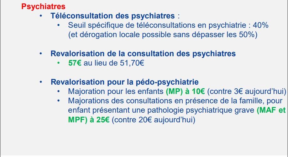 Les consultations pédopsychiatrie sont revalorisées. Dans le détail :