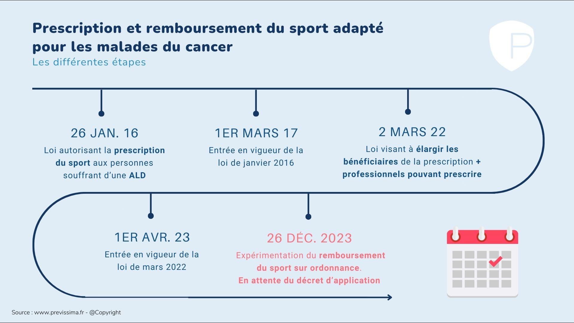 - Tout a commencé en 2016, avec la loi de modernisation de notre système de santé qui a introduit la possibilité, pour le médecin traitant, de prescrire une activité physique aux personnes souffrant d’une Affection de longue durée (ALD). La mesure n’entre en vigueur que le 1er mars 2017 ;