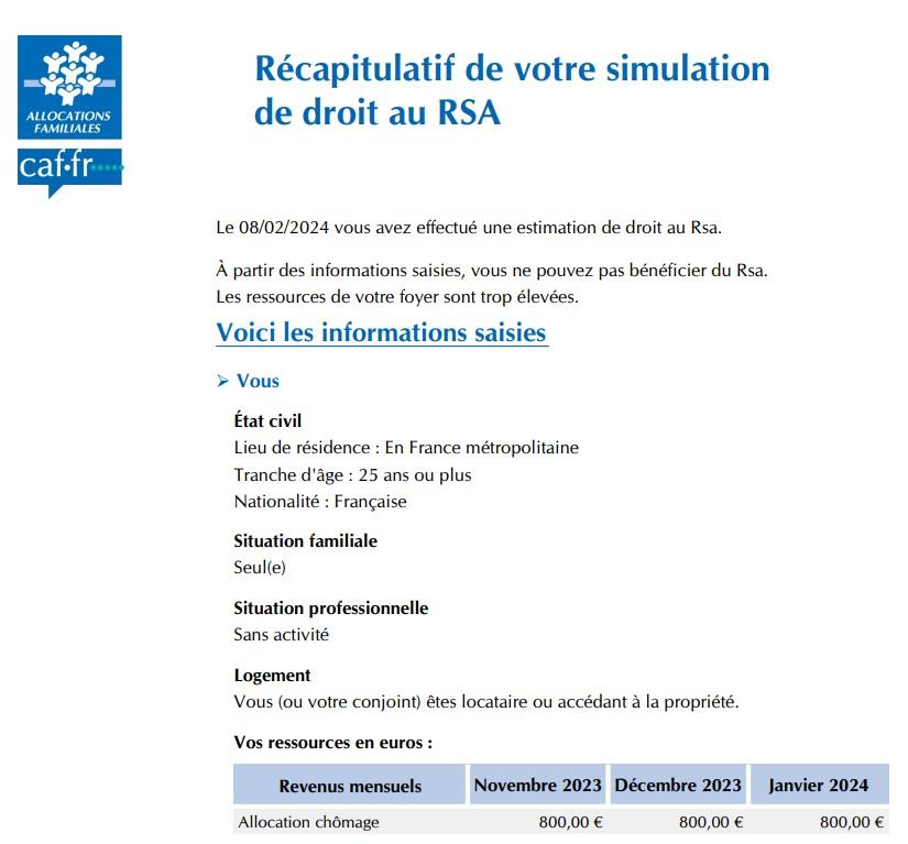 Dans la même situation, selon une simulation CAF, ses ressources seraient trop élevées pour ouvrir droit au RSA. Ci-dessous, les résultats du simulateur CAF :