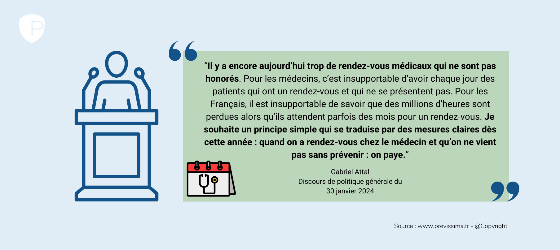 C’est dans son discours de politique générale, prononcé le 30 janvier devant l’Assemblée nationale, que le premier ministre est revenu sur le sujet. Ses propos ont le mérite d’être clair « je souhaite un principe simple qui se traduise par des mesures claires dès cette année : quand on a un rendez-vous chez le médecin et qu’on ne vient pas sans prévenir : on paye ».