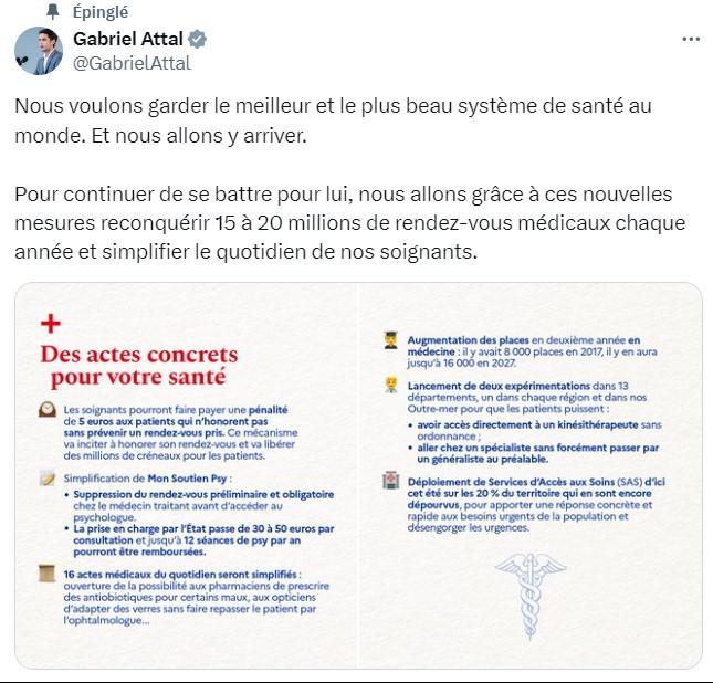 Dans son discours de politique générale du 30 janvier, Gabriel Attal avait quant à lui déclaré « je souhaite un principe qui se traduise par des mesures claires dès cette année : quand on a un rendez-vous chez le médecin et qu’on ne vient pas sans prévenir, on paye ». Une volonté qu’il vient de réaffirmer devant la presse régionale.