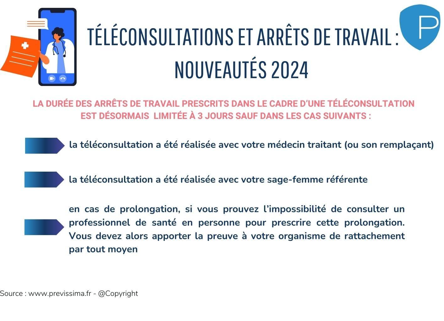 Ainsi, depuis le 27 février 2024, tout arrêt de travail prescrit dans le cadre d’une téléconsultation est limité à 3 jours dès lors que le prescripteur n’est ni votre médecin traitant ni votre sage-femme référente dans le cadre d'une grossesse.