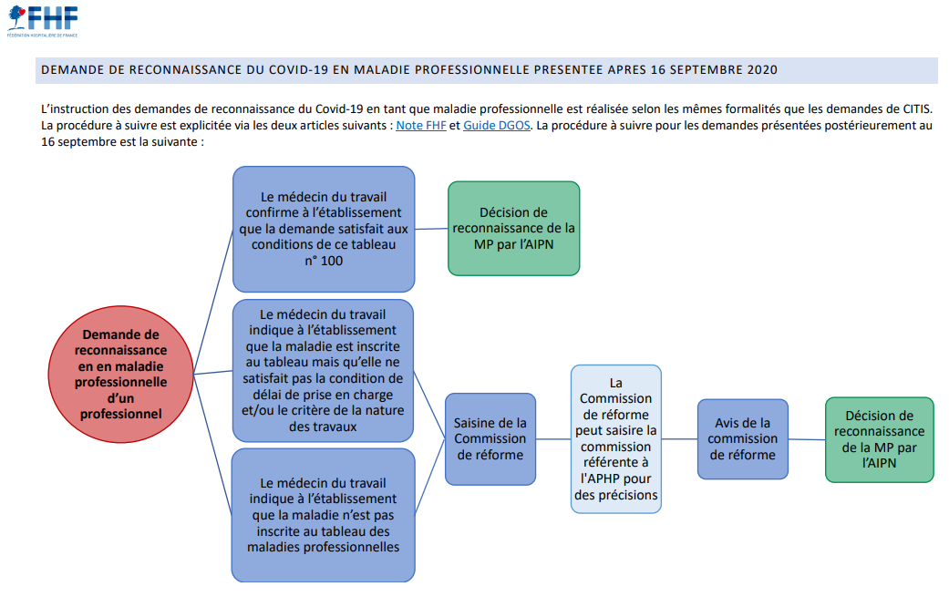 L’instruction DGOS indique que s’agissant des fonctionnaires, la reconnaissance en maladie professionnelle des pathologies liées à une infection au SARS-CoV2 doit se faire par référence au tableau n°100 du décret du 14 septembre.