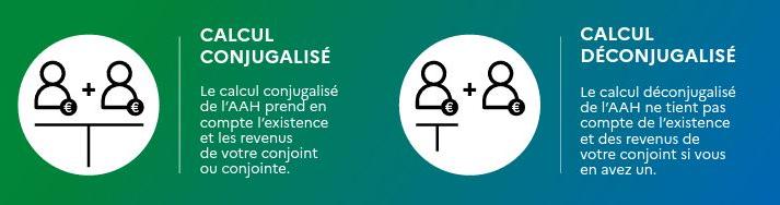 - Vous êtes en couple et bénéficiez de l’AAH : depuis le 1eroctobre 2023, le calcul de votre AAH est déconjugalisé. Cela signifie que les ressources de la personne avec laquelle vous vivez en couple ne sont plus prises en compte dans le calcul de votre AAH. Toutefois, si la déconjugalisation est moins avantageuse financièrement pour vous, la prise en compte des ressources de la personne avec laquelle vous vivez en couple est maintenue dans le calcul de votre AAH (on parle de conjugalisation). Notez que, dès lors que le calcul conjugalisé ne vous avantage plus, votre AAH est calculée de façon déconjugalisée et ce, de manière automatique et définitive ;