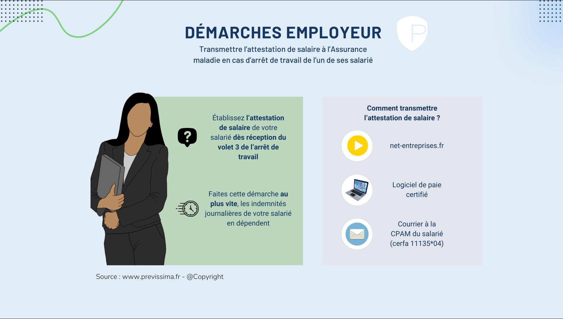 - La transmission de l’attestation de salaire à l’Assurance maladie, en cas d’arrêt maladie du salarié ;
