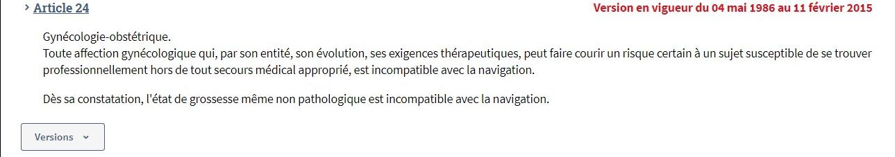 Jusqu’à fin 2015, toute femme marin enceinte était suspendue de navigation dès sa déclaration de grossesse. La raison ? Les dispositions de l’article 24 de l’arrêté du 16 avril 1986 relatif aux conditions d'aptitude physique à la profession de marin à bord des navires de commerce, de pêche et de plaisance rendait l’état de grossesse incompatible avec la pratique de la navigation.