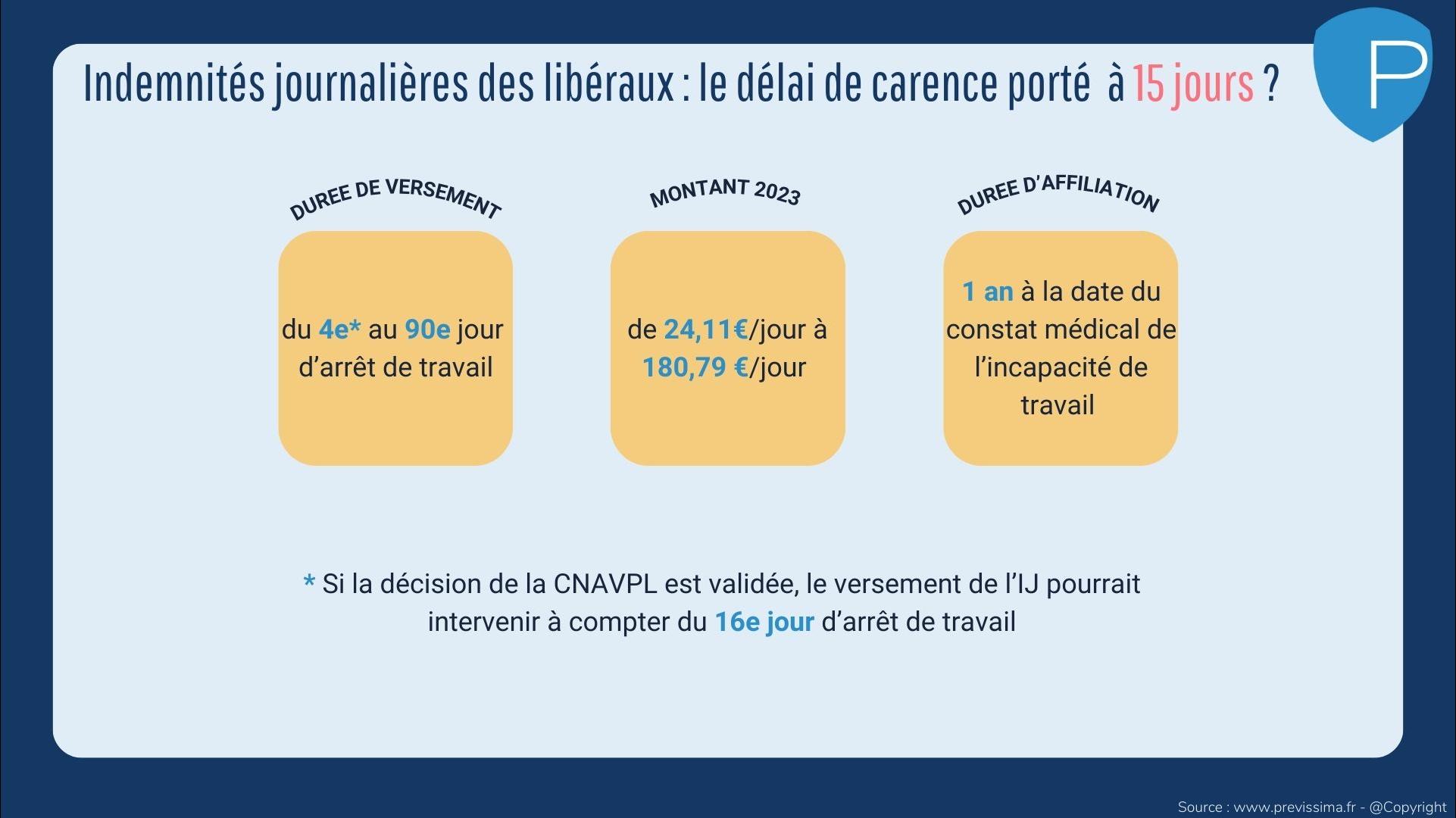 Les choses devraient bientôt évoluer… dans le mauvais sens malheureusement ! En effet, lors de son conseil d’administration en date du 7 décembre dernier, la Caisse nationale d’assurance vieillesse des professions libérales constatant un déficit du régime des professions libérales (-70 millions d’€ en 2021 et -30 millions d’€ en 2022), a décidé de rallonger le délai de carence en cas d’arrêt de travail à 15 jours.