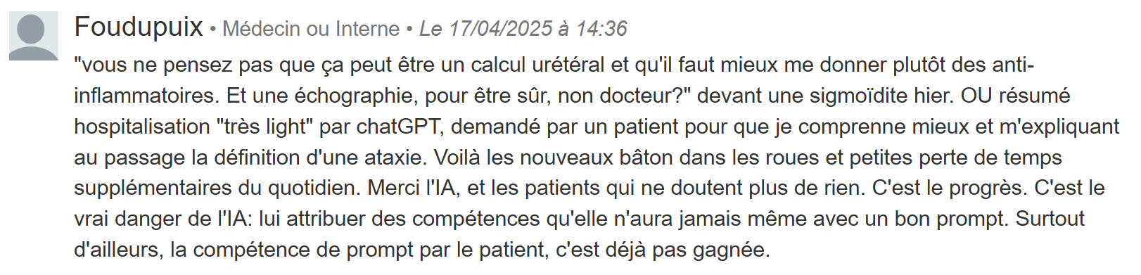 D’autres voient l’arrivée de l’IA d’un moins bon œil, comme ce médecin dans l’espace commentaires d’un article sur le sujet chez nos confrères Le Quotidien du Médecin, qui s’insurge contre ces « nouveaux bâtons dans les roues et petites pertes de temps supplémentaires du quotidien ».