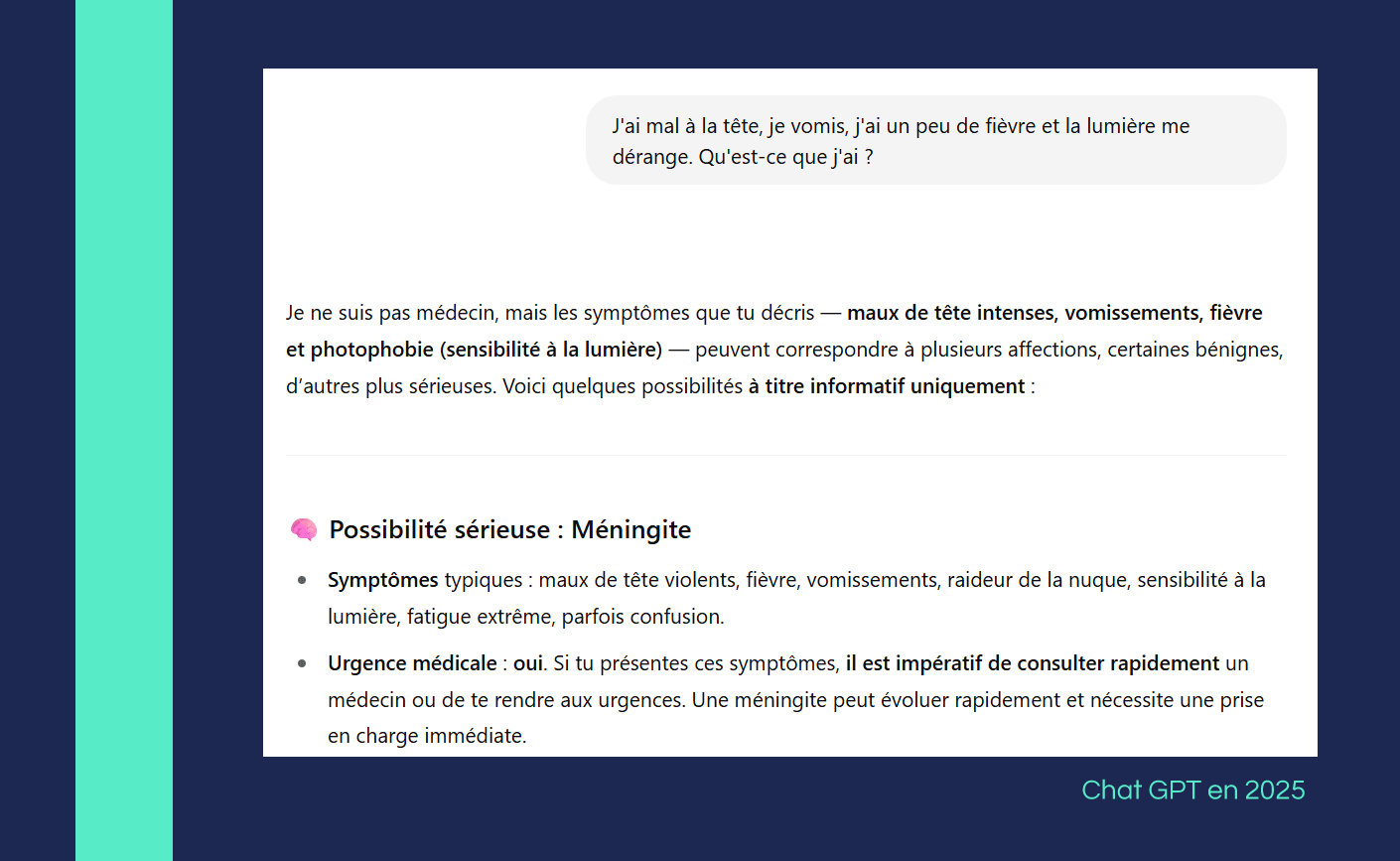 Ces limites étant posées, il convient cependant de reconnaître que les outils d’IA génératives progressent à une allure folle. La différence entre le Chat GPT de 2023 et celui de 2025 est d’aucune mesure. À titre d’exemple, là où la version 2023 échouait à diagnostiquer une méningite, Chat GPT 4o y arrive avec brio aujourd’hui.