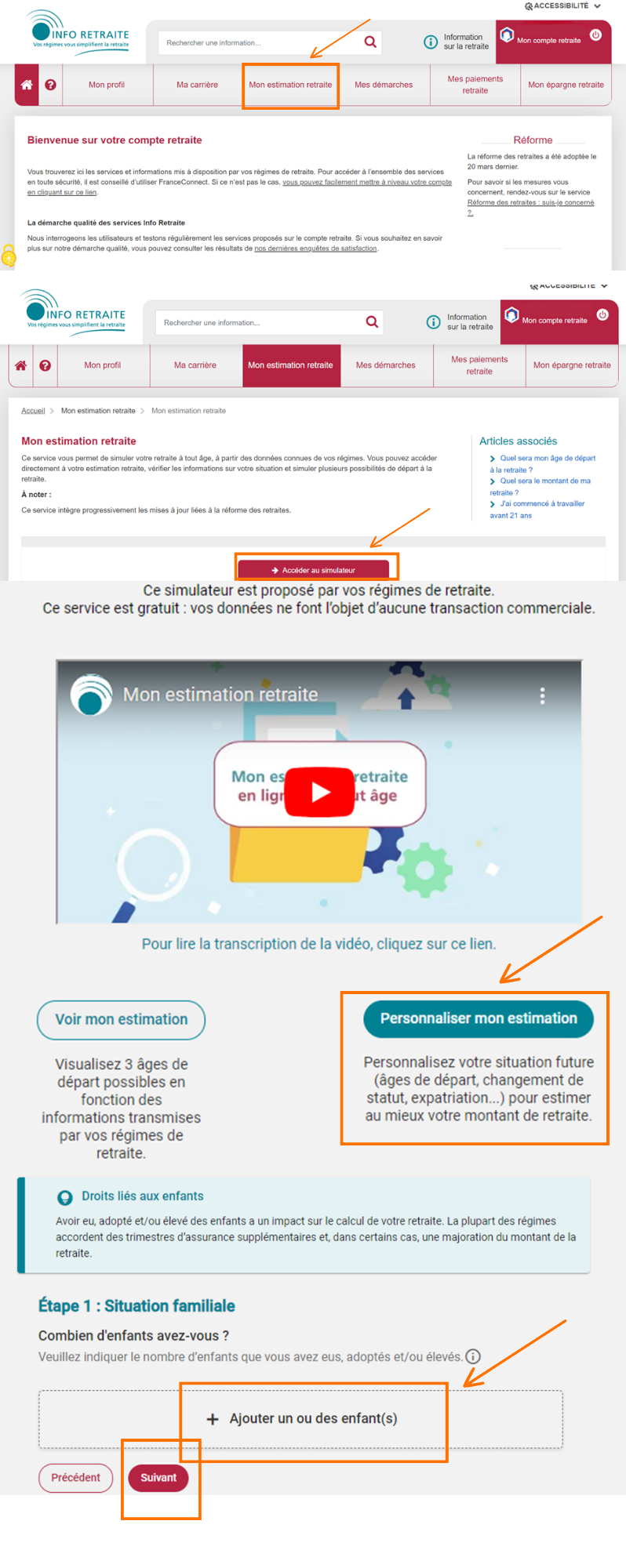 - Créer votre espace personnel, ou se connecter sur votre compte retraite à partir du site inforetraite.fr en cliquant sur le bouton « Mon estimation retraite », ou « Estimer le montant de ma retraite » via le site de l’assurance retraite.fr à partir de votre espace personnel.