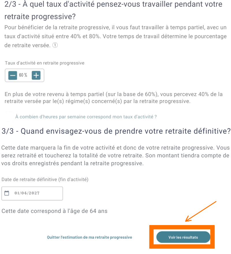 - Une fois sur l’outil de simulation retraite progressive : un bref rappel du dispositif est affiché en entête avant de vous demander de répondre à une série de 3 questions (date de départ en retraite progressive souhaitée, taux d’activité réduit durant la période de retraite progressive qui doit être compris entre 40 % et 80 %, date de retraite définitive souhaitée).