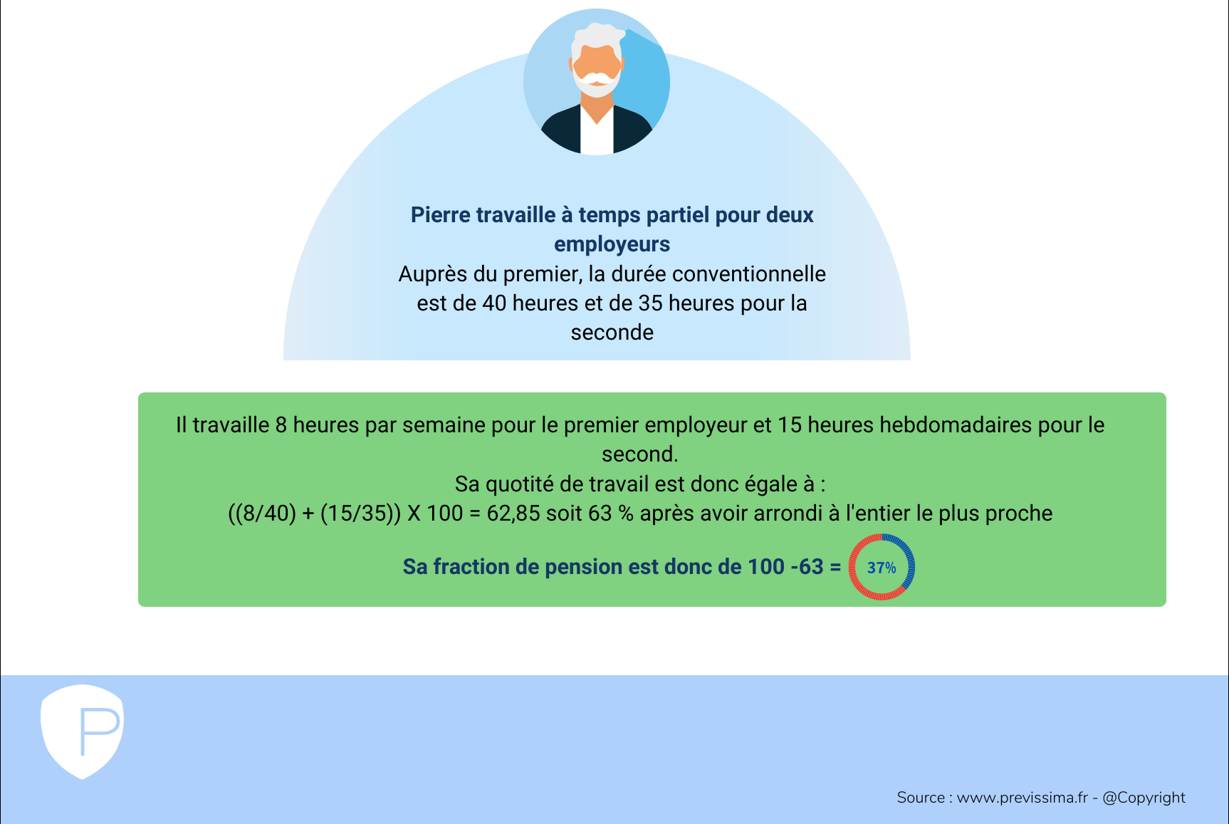 Si vous êtes salarié multi-employeurs, le pourcentage de fractionnement de votre pension de retraite progressive est égale à la différence entre 100 % et la somme des quotités de travail à temps partiel par rapport à la durée du travail à temps complet applicable dans chacun de vos emplois.