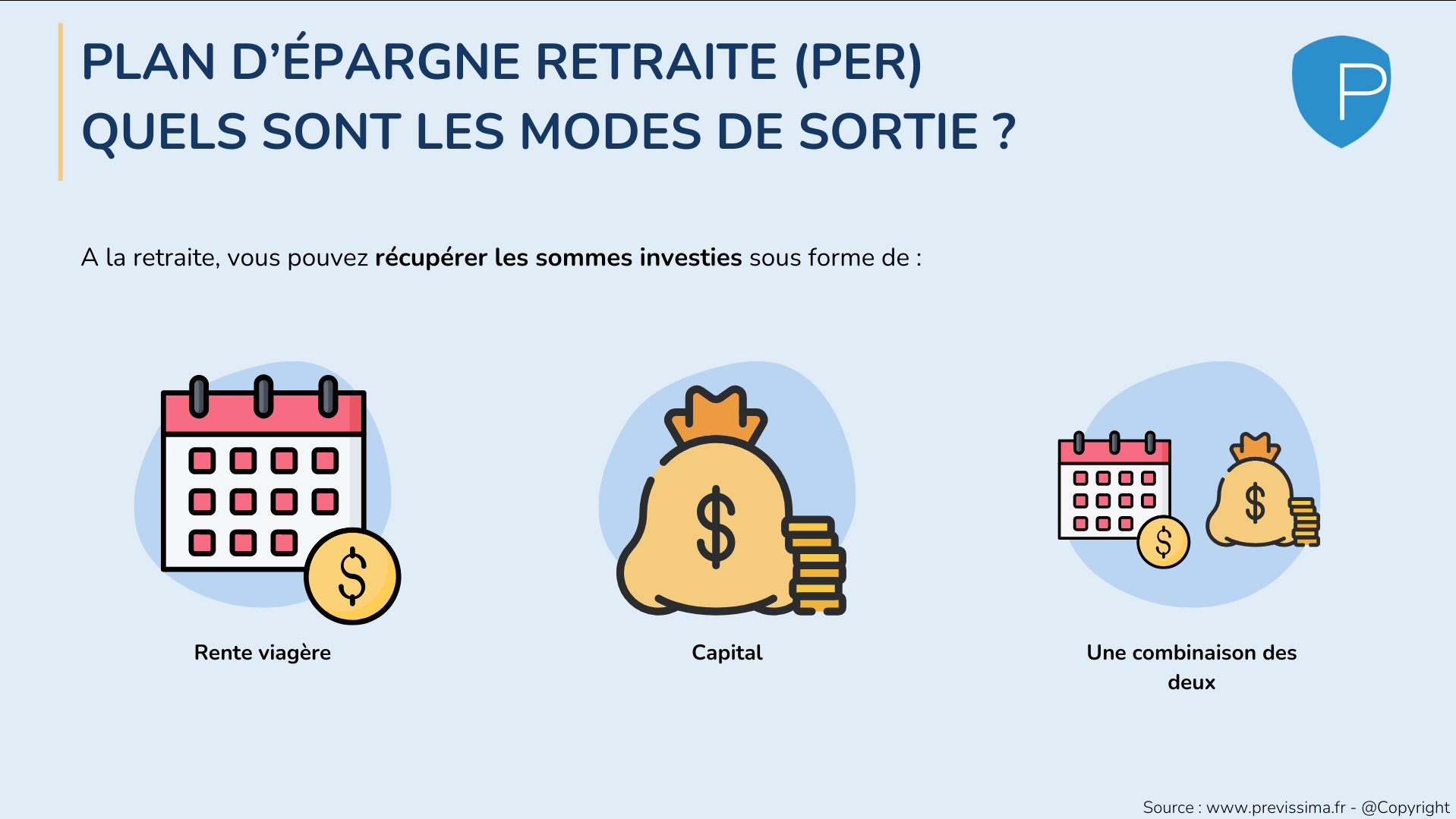 Notez que certains PER peuvent proposer diverses options de rente : rente de réversion, rente avec annuités garanties, rente majorée/minorée, rente progressive, etc.