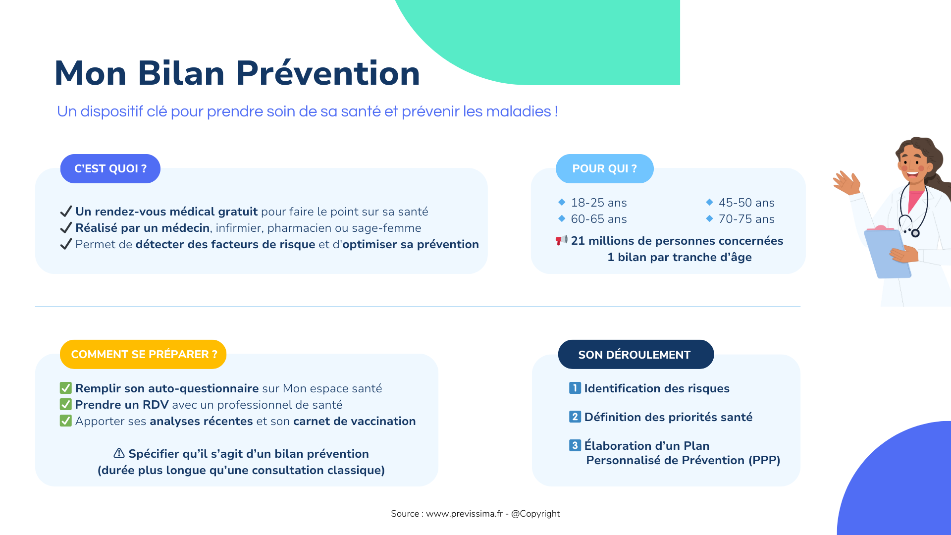 À noter : si vous prenez rendez-vous avec votre médecin traitant, pensez à préciser qu'il s'agit d'un bilan de prévention, car sa durée est plus longue qu'une consultation classique.