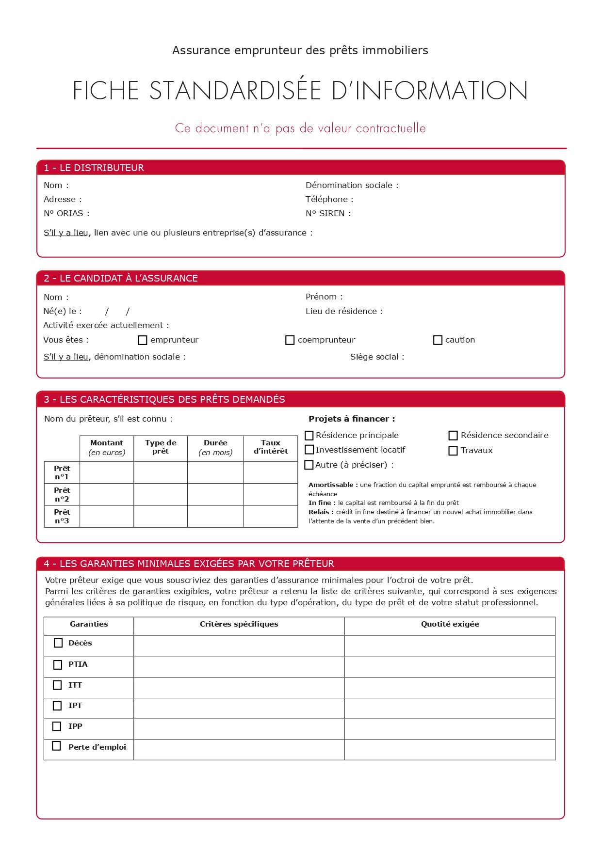 La Fiche Standardisée d’Information (FIS) qui vous a été remise dès la première simulation de prêt immobilier détaille les garanties et niveaux de couverture minimum exigés par votre organisme prêteur. Elle doit comporter :