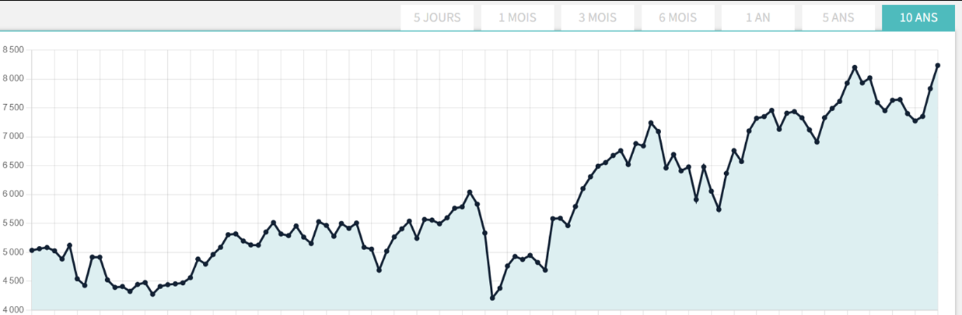 Morale : malgré les krachs boursiers ou des séances très difficiles en Bourse, le CAC 40 s'en est toujours remis. Et cela est encore plus vrai pour les indices américains, où les performances sont exceptionnelles : +172 % ces dix dernières années pour le S&P 500 et +250 % pour le Nasdaq Composite !