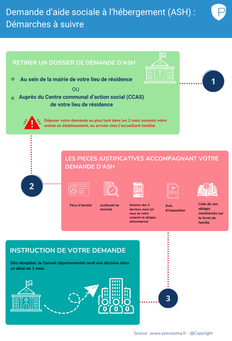Pour effectuer une demande d’aide sociale à l'hébergement (ASH), vous devez retirer le dossier de demande auprès de la mairie ou, du Centre communal d’action sociale (CCAS), de votre lieu de résidence. Il n’existe pas de formulaire national unique, chaque département établi son propre formulaire de demande d’ASH. Vous pouvez solliciter l’aide d’un assistant de service social du CCAS, ou de la mairie, pour vous accompagner dans vos démarches administratives.
