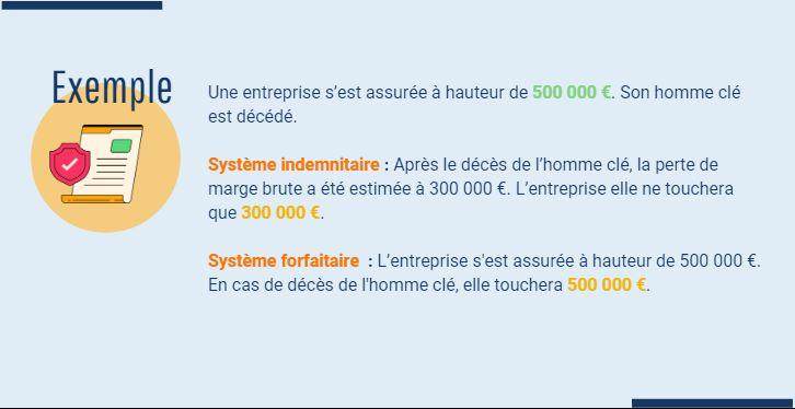 - Le système indemnitaire : l'indemnité servie est liée au préjudice financier subi (perte de marge brute de l'entreprise consécutive au décès de l'homme clé) ;