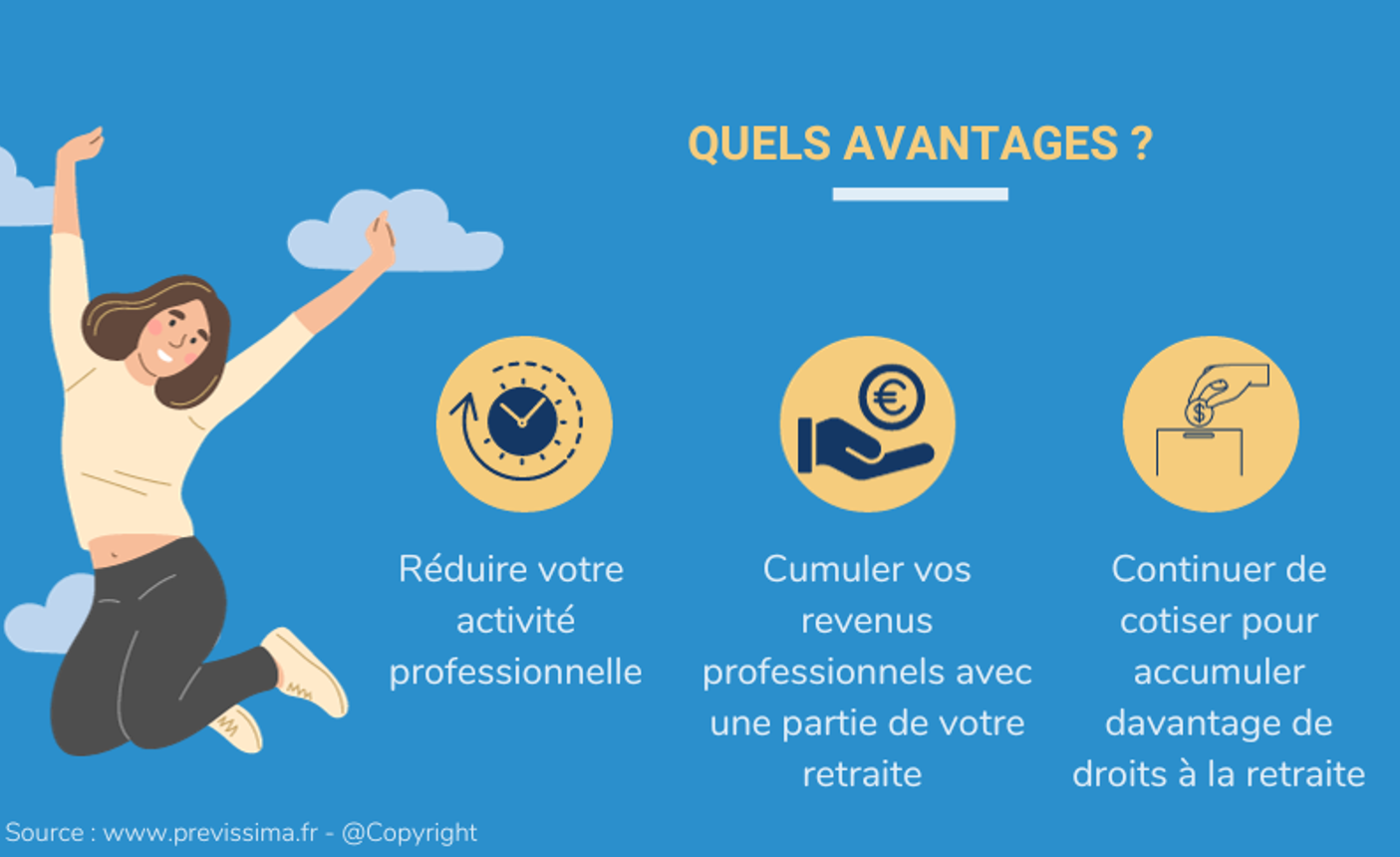 - De cumuler vos revenus professionnels avec une partie de votre retraite : vous n’avez pas de perte de revenus majeure ;