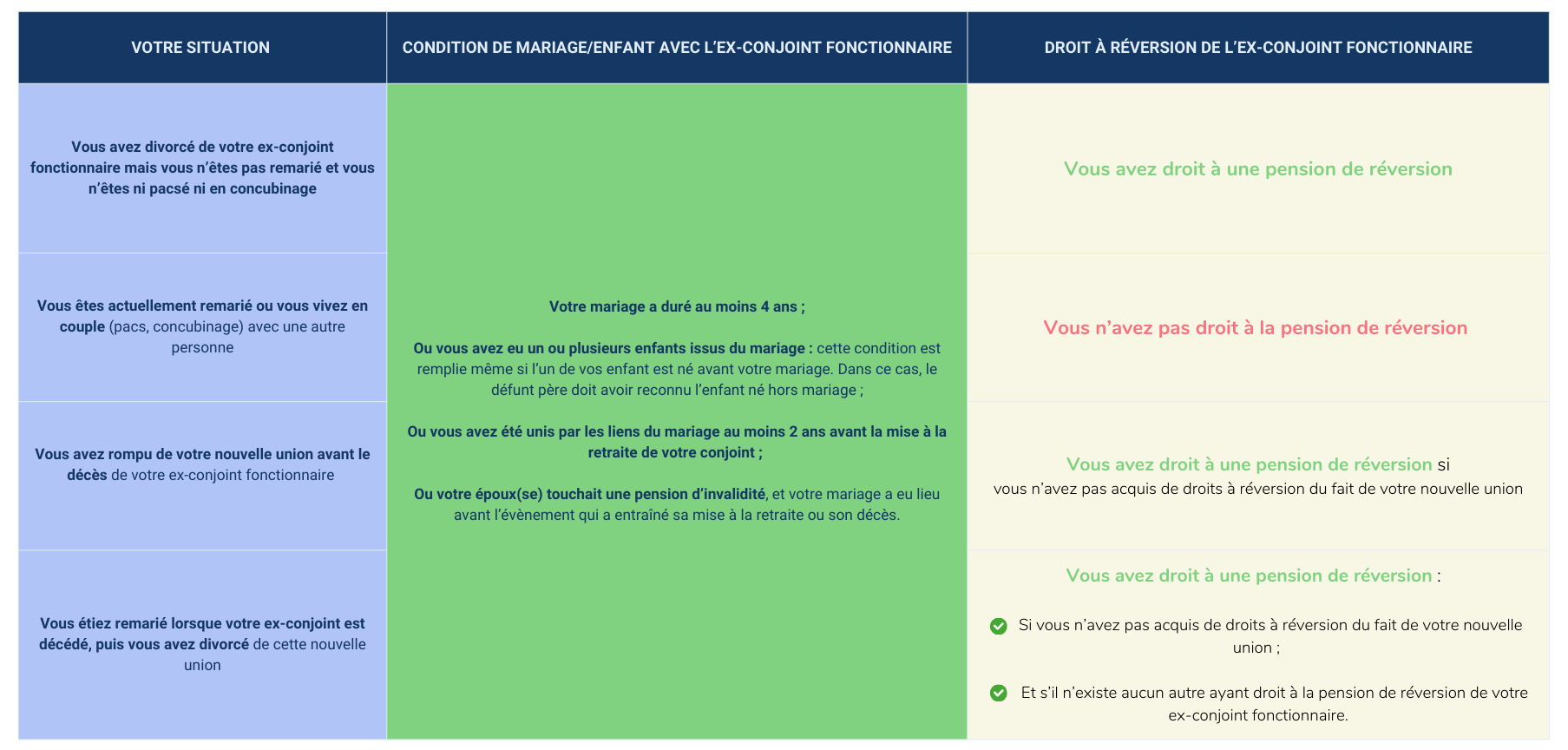 Ensuite, votre droit à pension de réversion dépend de votre situation :