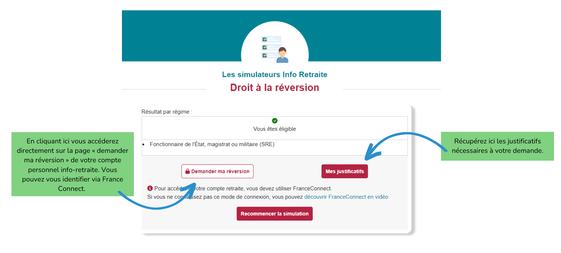 Vous pourrez ensuite directement procéder à la demande de réversion, en vous connectant via FranceConnect. Le plus : de cette page, vous pouvez télécharger la liste des documents justificatifs nécessaires à votre demande !